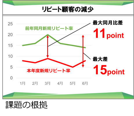 その際、数値化できる場合は数値を大きく表示し、現状の課題に対する認識を強めます。