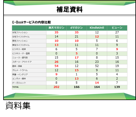 プレゼン後、質疑応答の時間に突っ込んだ質問が出された場合、それに対応する情報として用意しておきます。ここで、しっかりと検証された情報をまとめておければ、決済側にとっての不安を取り除く要素となります。