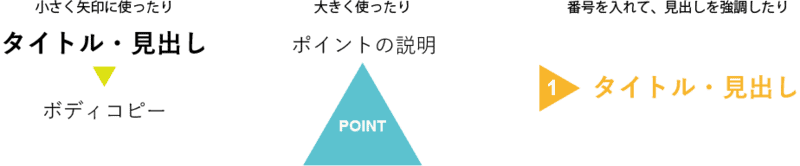 三角形は三点が尖った形をしていますので、頂点を有効活用することで、見る人の視線を誘導することができます。矢印の代わりとして使うことができます。